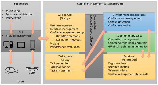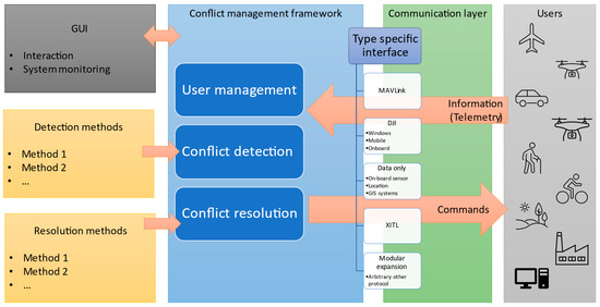 Figure 1 shows the architecture of the proposed framework concept. The key development areas are coloured in blue; these are the components that need to be built from scratch to achieve the desired functionality. The communication and user layers are items that are intentionally left to use only COTS solutions. The detection and resolution methods are coloured differently. The framework can work by integrating these algorithms, even if they are already developed or available only as a black box tool. The tools used can be changed in a modular way in the system. The final piece of the system is the GUI (graphical user interface), which enables a human supervisor to monitor the system and interact with it if necessary. It is not coloured blue, because there is no strict need to develop an independent GUI; the proposed system could integrate with other tools with existing GUIs, as long as appropriate interfaces are developed for data sharing.