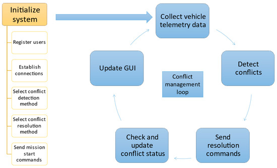 Figure 2 shows a top-level overview of the first framework version’s workflow. First, in the system initialization step, the system goes through five tasks, after which it initiates an infinite loop where conflict management is facilitated. The system components are presented and discussed following the order presented in the flow diagram.