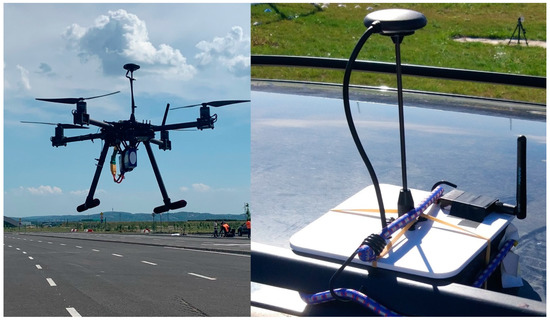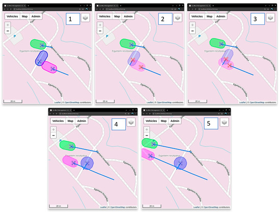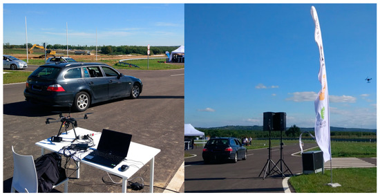 The current state of the research project was also presented at a live demo conducted in the ZalaZone Proving Grounds in Hungary. The demo was aimed at demonstrating the core principles of the conflict management system. Unfortunately, during the demo, the allocated space was rather limited, and only a single intersection of roads was made available, so the scope of the demonstration was also limited. Refer to Figure 11 for photographs taken at the event. In the demo, the UAV has received a repeating mission to fly between the two sides of the intersection. The ground vehicle had the PX4-in-a-box unit mounted to the roof and was operated by a driver. A manned ground vehicle seemed like the appropriate choice for such limited space, as the intention was to demonstrate that the system can react to a wide variety of situations that can arise. Relying on a driver means that the driver can also improvise in the situations and demonstrate the safe workings of the system. The demo was successfully presented, and while the system’s performance was excellent, some areas for further improvement were identified.