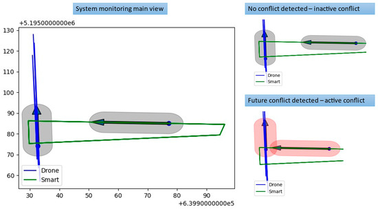 This paper is aimed at developing a system prototype that can be used to implement the short- and mid-term conflict management of a local U-Space system containing both autonomous aerial and ground vehicles, along with other potential users. The inclusion of both aerial and ground autonomous systems in a common management framework can be considered as a novel idea. The pairing of self-driving cars and UAS has been experimented with, but only for specific applications such as food delivery [15], search and rescue [16] and infrastructure inspection [17]. There are also research works available that focus on the technological specifics of such integration [18,19]. Published studies of conflict management approaches that combine autonomous ground and aerial vehicles are unknown to the author.
