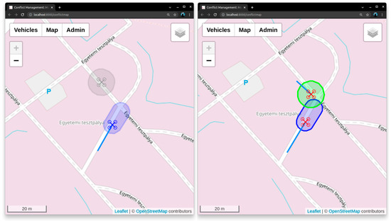 The PX4-based users connect to the system via telemetry radios (the particular type of hardware is called SiK radio), sending telemetry data and commands as MAVLink messages via serial communication. This solution is one of the most widespread and available for open-source drones today. They operate on nominal 433 MHz using a frequency-hopping method to enable a number of these units to work simultaneously without interference. One end of the unit is connected to the vehicle and the other to the PC running the conflict management framework. These radios are primarily designed to work in pairs, and while multiple units could be connected for multi-point comms, in the authors’ experience, it does not work suitably for this purpose. Considering this, during the operation of a production version of the conflict management system, these radios will be plugged in to the computers of the users who are operating the drones and not to the central conflict management computer. These telemetry radios are used by the operators to monitor the status of the UAV and manage missions. Routing and forwarding the communication to the system via UDP or TCP (transmission control protocol) can relatively easily solve this problem. For other type of radio systems, different interfaces need to be implemented, and this is part of the longer-term development plans.