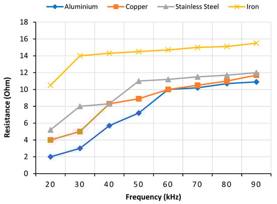 Frequency vs. resistance of different ferromagnetic and non-ferromagnetic materials (data taken from [31,32]).
