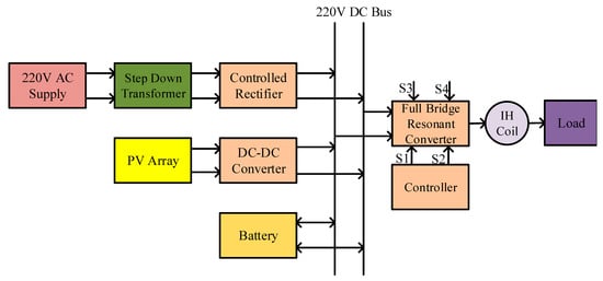 In this proposed induction heating system, input was received by 220 V DC bus from three different sources—namely, 220 V AC supply (grid), PV array, and battery. For this system, the 220 V AC supply taken from the grid could be reduced to the desired voltage with the help of an autotransformer and the controlled rectifier. The output of the PV array was fed to the DC–DC converter in order to convert it into the required voltage and transfer it to the 220 V DC bus. When there was no PV power, the battery was discharged to the load, whereas the battery was charged when the PV power was available. This is the function of the nanogrid, which automatically controlled the charging and discharging of the battery based on the availability of other sources and the load. A half-bridge resonant converter was connected to the DC bus. This converter was used to change the operating frequency of the IH coil. Several combinations of inductor and capacitor were controlled by switches (S3 and S4) to change the operating frequency. To control the switches in the resonant tank and to give PWM pulses to MOSFET (S1 and S2), a controller was employed. This controller changed the pulses generated and the switches in the resonant tank as per the mode selected. The block diagram of the proposed system is shown in Figure 3. Here, the induction heater was powered by the nanogrid, which was used to reduce the electricity bill and also the burden on the grid. The nanogrid was employed as a valuable addition to this study because it is an emerging technology that has considerable benefits for both consumers and distributors.