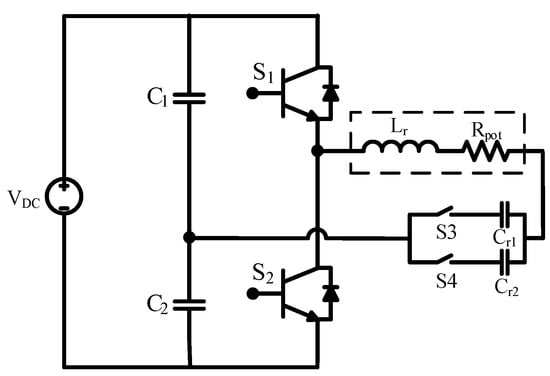 With these pulses, the energy was transferred to the load and pulses when the switch S1 was ON or S2 was ON. For the first condition, when S1 was in the ON state, the energy transfer was through S1, Lr, Rpot, Cr2, and S4, and for when S2 was in the ON state, the energy flow was in the direction through S4, Cr2, Rpot, Lr, and S2. The maximum power available in this mode is given by Equation (7).