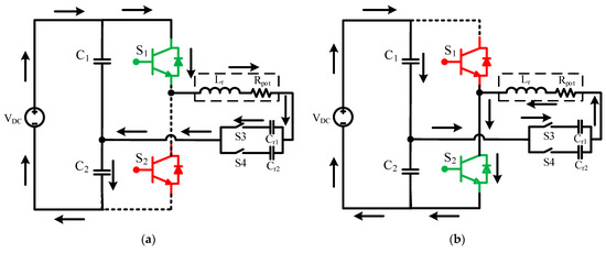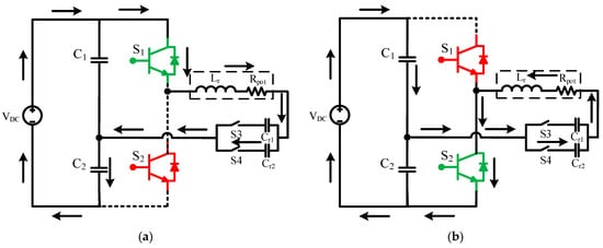 Circuit diagrams for non-ferrous heating mode: (a) S1 in ON state; (b) S2 in ON state.