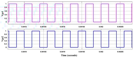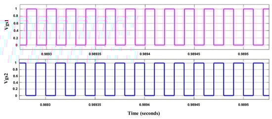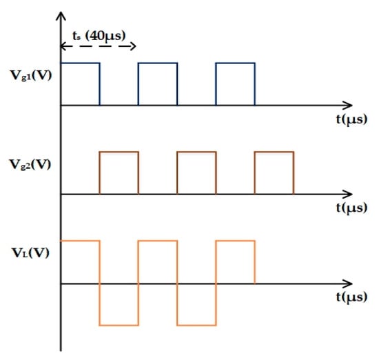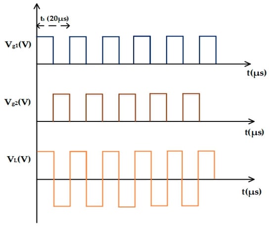 In the ferrous heating mode, as shown in Figure 5, the equivalent voltage for the series resonant inverter was half as that of the input voltage (220 V) that was transferred to the load. Figure 6 shows the PWM pulses required for the MOSFET switches.
