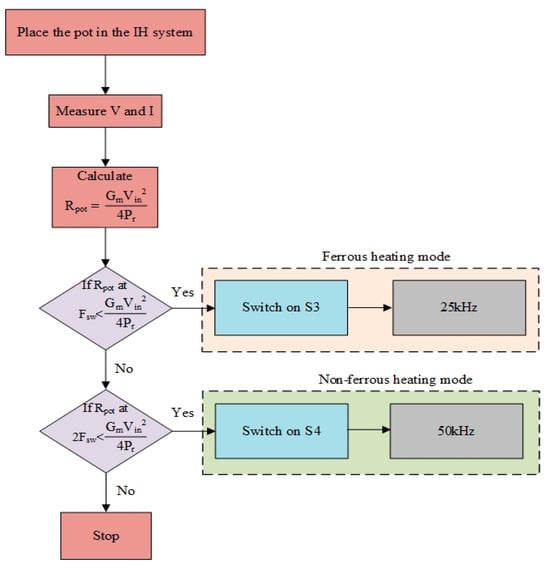 For each mode of operation, a separate circuit breaker was implemented in the hardware system; to change the mode of operation, a specific circuit breaker was closed, and the remaining breaker was open at that particular instant. Thus, for a particular mode, a specific circuit breaker was allotted. Thus, the breaker S3 was used to operate the system in ferrous heating mode, and S4 was used for non-ferrous heating mode. Firstly, when the metallic pot was placed in the IH system, voltage and current could be measured, and then, the pot resistance was calculated by using the expression mentioned in Figure 9. After that, the pot resistance at switching frequency was compared with the calculated pot resistance. If the condition was satisfied, then the switch S3 would be turned ON and ferrous heating mode would be selected; otherwise, it would move to the next condition. Here, the pot resistance at twice the switching frequency was compared with the calculated pot resistance; if it was satisfied, the S4 would be turned ON. However, if the condition was not satisfied, the system would stop. Under each mode of operation, specific values of resonant tank capacitor and inductor were connected to the system, and the breakers were used to isolate the unwanted part of the system, which was not required during each mode of operation. The values of the resonant capacitors and resonant inductors for each mode of operation are shown in Table 1.