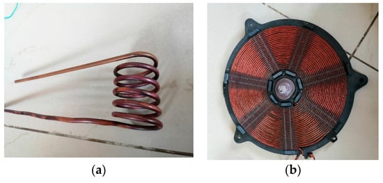 Figure 15 shows the complete hardware integration setup of the 2 kW induction heating system that was tested at all different modes of operation and for different types and sizes of metals. In ferrous heating mode, stainless steel with the shape of a bowl and size of 8 cm× 3.7cm was used. On the other hand, for the non-ferrous heating mode, copper with the shape of a bowl and size of 8 cm × 3.7 cm and aluminium with the shape of a bowl and size of 16 cm × 3.2 cm were used. Figure 16 shows the working coils used for heating different shapes of metals. The first one was used to heat rod-type metals, whereas the second one was used to heat flattened surface vessels.