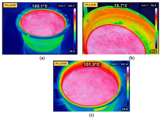 Thermal image of heating different metals: (a) stainless steel; (b) aluminium; (c) copper (power rating: 2 kW and time period: 100 s).
