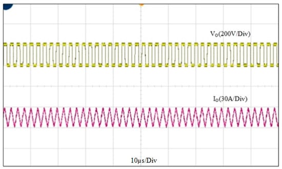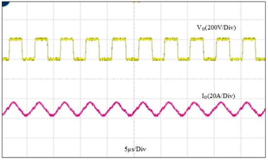 From Figure 14, it can be proved that the magnitude of the output voltage (±110 V) was half of the input voltage (220 V). The output current of this mode was 14 A, which was higher than that of the ferrous heating mode.