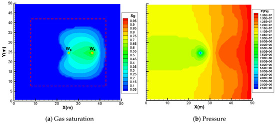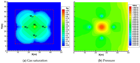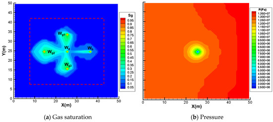 Gas saturation and pressure nephograms after gas injection for 6 months (the red dotted line box represents the hydraulic fracturing area).
