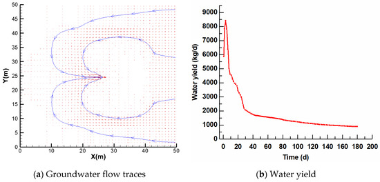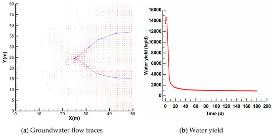 - Taking the one-to-one and five-spot patterns as examples, the characteristics of groundwater flow were studied. Under the one-to-one pattern, the external groundwater flows into the production well from the low-pressure side, and the water yield of the production well was basically stable at 1000 kg/d. In the five-spot pattern, groundwater can flow into the production wells directly from the windward side, and the water inflow of the production well on the leeward side mainly comes from the desaturated zone; the water yield of each production well remains at a high level.