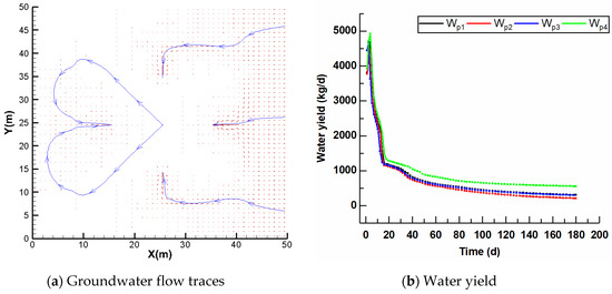 As shown in Figure 3a, the gas saturation between wells in this pattern is significantly higher than that in the one-to-one pattern, and the effective pyrolysis range is larger. The hydraulic gradient mainly exists in the inter-well area, while the hydraulic gradient outside the production wells is small. Under the dynamic action of groundwater on the right, the desaturated area develops slightly to the left. It can be seen from the groundwater trace in Figure 4 that the groundwater can directly flow into Wp1, Wp3, and Wp4 under a hydraulic gradient, while the water yield in Wp2 mainly comes from the continuous displacement of groundwater by high-pressure gas. Under the long-term high-pressure displacement, the inter-well water saturation decreases gradually, and the movable groundwater content also decreases gradually. Therefore, compared with the other three production wells, the water yield of Wp2 is the least, at ~300 kg/d, and the water yield of Wp4 is as high as 700 kg/d. According to the groundwater flow trace, it presents that only the water yield of Wp2 will carry pyrolysis products, while most of the other three wells are the direct infiltration of external groundwater, which has little mass exchange effect on the pyrolysis zone. In summary, the sewage production remains at a high level under this pattern.