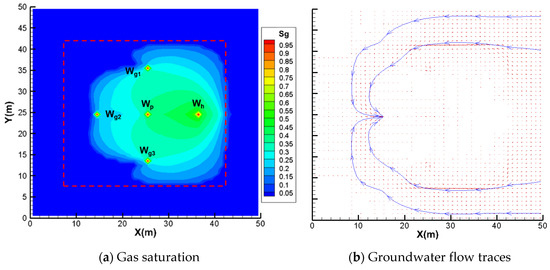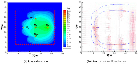 Gas saturation nephogram and groundwater flow traces in the gas flooding pressure of 5 MPa.