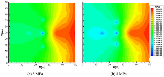 Pressure nephograms when the gas flooding pressure is 5 and 3 MPa, respectively.