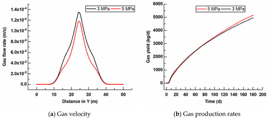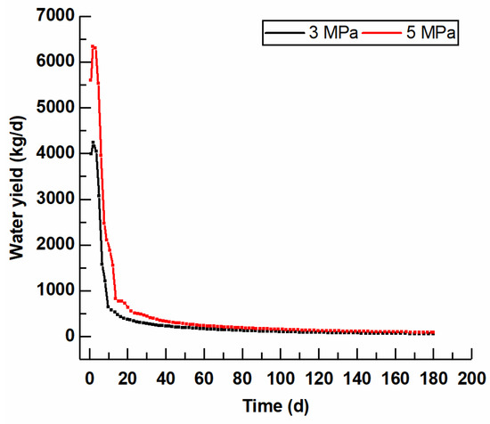 Since the gas flooding pressure of 5 MPa realized the shielding effect on the groundwater, the gas flooding pressure was further reduced to 3 MPa in this paper. As shown in Figure 8, the range of the whole desaturated zone and the gas saturation change slightly, and the water flow trace was almost consistent with that of the 5 MPa condition. Therefore, from the perspective of restraining groundwater intrusion, a gas flooding pressure of 3 MPa can also meet the engineering requirements. Figure 10 presents the water yield of the production well when the gas flooding pressure is 5 and 3 MPa. It can be seen that the water yield of the production well can be reduced and stabilized within 100 kg/d under the two pressure levels. When the gas flooding pressure was 5 MPa, the water yield of the production well was slightly higher at the initial stage of gas injection but with the displacement of groundwater, the water yield of the production well was basically the same.