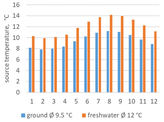 Monthly and annual mean source temperatures for ground-source heat pump and freshwater.