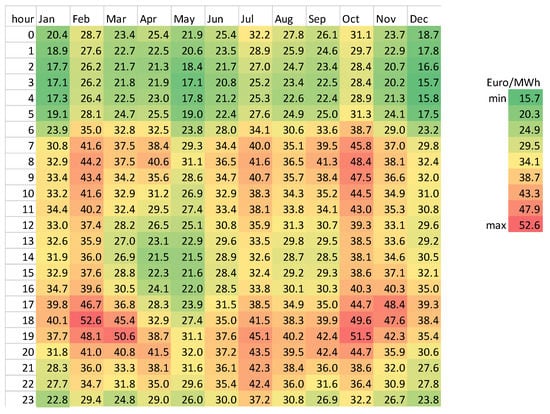 As no Swiss spot market prices are available at the time of the study, 15-min spot market prices from Germany for the year 2015 are used [40]. Figure 2 shows the monthly mean spot market prices for each hour of the day. There is no clear seasonal trend for low/high prices. The spot market prices are mainly low during the night (green color) and high during the day (red color). With the penalty signal of spot market prices, the goal is to use the energy in low price periods. In general, it is favorable to operate the heat pump at night and early in the morning. Also, a short window during early afternoon shows low spot market prices. As the spot market prices are pure energy prices and all levies are missing, the energy prices are supplemented with the levies for the flat tariff of (Table 2) for the sake of comparison.