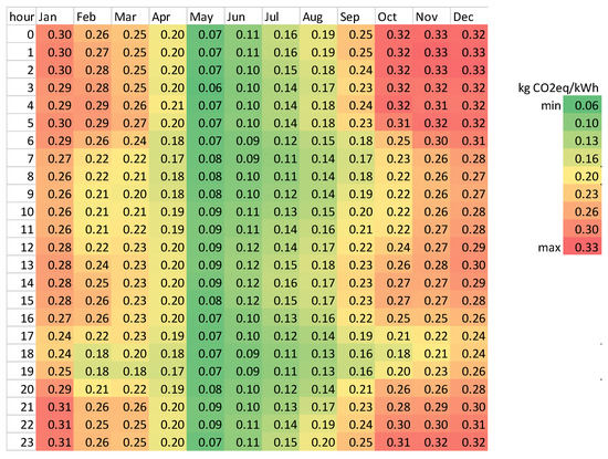 Renewable energy but also nuclear power plants cause low CO2eq emissions. Since nuclear power plants are inflexible and are used for base load coverage, one can assume a continuous base load of CO2eq emissions from these plants. The CO2eq emissions on top depend on the amount of renewable energy in the grid. Therefore, the CO2eq emissions can be used as an indicator of the renewable energy amount in the electricity mix of the grid. Low CO2eq emissions are considered to correlate with a high amount of renewable energy. CO2eq emissions are related to the CO2eq coefficients. Low CO2eq coefficients lead to low CO2eq emissions and vice versa. Figure 3 shows the monthly mean values for each hour of the day for the CO2eq coefficients of the Swiss electricity mix in 2015/2016 [41]. The green color indicates low and the red color high CO2eq coefficients. The lowest CO2eq coefficients can be seen for the whole month Mai. In general, the CO2eq coefficients are lower during the summer months May through August than in winter from September to April. The CO2eq coefficients fluctuate during each day. Both low and high coefficients can appear during nighttime and daytime. However, low coefficients are increasingly found during daytime. The mean monthly daily course shows the lowest CO2eq coefficients during 6 am–8 pm. Attempting to draw from the grid during times with low CO2eq coefficients favors energy consumption during daytime.