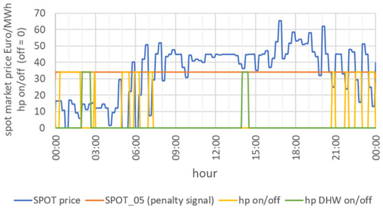Figure 4 shows a control example of one simulated winter day with the penalty signal SPOT_05. The orange line represents the daily mean spot market price, and the heat pump is allowed to run for heating if the current spot market price (blue line) is below this line. The yellow line shows when the heat pump is on/off for heating. If needed, longer on-periods would have been possible during the early morning hours. Also, three short periods were not used during the day. The DHW generation is during the allowed times (green line). The same methodology also applies to the other penalty signals. The controls presume that the penalty signal values are known in advance. Additionally, it is verified that the operative temperatures of all zones are always above 20 °C.
