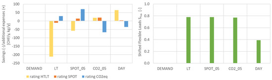 Results for the flexibility factors GSC, RIB, FF and FI taking a 3 kWp (left column) and 20 kWp (right column) photovoltaic system into account are shown in Figure 7. The production cost for self-consumption is set to 20 Rp/kWh [46] and CO2eq emissions are set to 0.072 kg/kWh [47].