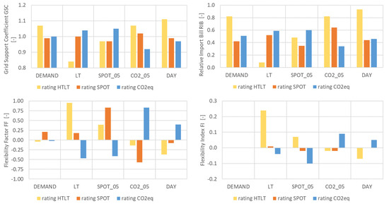 Flexibility factors GSC (top left), RIB (top right), FF (bottom left), FI (bottom right) depending on penalty signals [44].