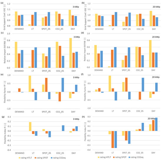 Flexibility factor GSC (a,b), RIB (c,d), FF (e,f) and FI (g,h) with self-consumption taken into account obtained with two photovoltaic systems (left: 3 kWp, right: 20 kWp [44]).