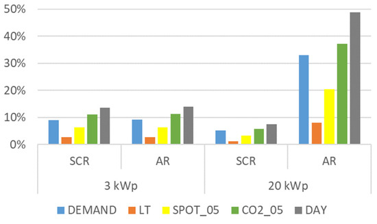 Self-consumption rate (SCR) and autarky rate (AR) for all penalty signals taking into account the self-consumption based on the yield of a 3 and 20 kWp photovoltaic systems.