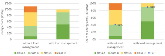 On the right side, Figure 9 also shows the Flexibility Classification Factor (FCF) as defined in Equation (8), below. The basis for FCF is the assumption that it is desirable to consume energy only during times with energy costs lower than the daily mean value. In other words, the flexibility classification must be in the green classes A and B. Thus, FCF is 100% (=1) when all energy costs are in classes A and B. This corresponds with a high use of flexibility and a depleted flexibility potential. FC is 0% (=0) when all energy costs are in classes C and D. In this case, unused flexibility potential is available. The higher the flexibility of a building, the higher the FCF value. The flexibility classification and the corresponding FC factor allow to address the flexibility potential and the savings and additional expenses compared to a bases case. Both parameters can also be used for CO2eq emissions or other penalty signals.