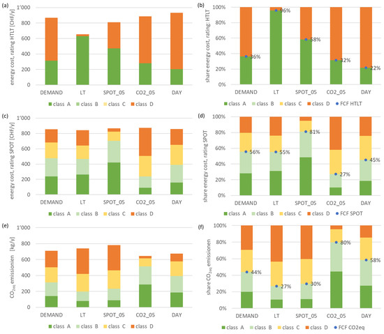 The flexibility classifications and FCF values are shown in Figure 10 for cases without a PV system. The rating HTLT only shows classes A and D because of the tariff profile (Figure 10, top). With the rating HTLT and penalty signal LT, the energy cost compared to the base case can be reduced by −24% (Figure 10, top). The FC factor increases to 96%, because almost the entire energy demand takes place during low tariff periods. The remaining 4% high price class D includes the standby during periods with the heat pump switched off. The flexibility potential is used up. Rating with SPOT and penalty signal SPOT_05 (Figure 10, middle) increases the annual costs by about 2% compared with the base case but at the same time increases the use of low prices (FCF = 81%). There is some flexibility potential still available. Looking at rating and penalty signal CO2eq emissions, savings of about −9% compared to the base case can be achieved (Figure 10, bottom). FCF increases to 80%. The flexibility potential is not completely used up.