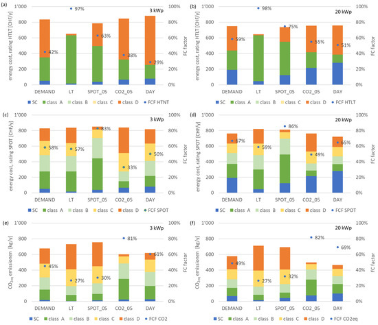 Flexibility classification and FC factors of energy costs (rating HTLT (a,b), rating SPOT (c,d) and CO2eq emissions (e,f) with photovoltaic system (left: 3 kWp, right 20 kWp).