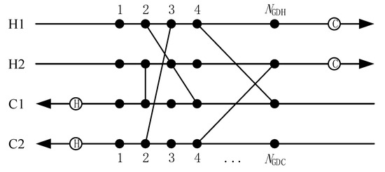 The main objective of the heat exchanger network optimization problem is to find an optimal HEN structure with the minimal total annual cost (TAC) for a given set of hot and cold streams with their supply and target temperatures, flow rates, and heat capacities, as well as hot and cold utilities with their temperatures and costs. In this work, a non-structural model of a HEN is used. Taking a network with two hot and two cold streams as an example, the non-structural model is considered, as shown in Figure 1. With the potential matching nodes setting on the streams, the non-structural model generates a heat exchanger by randomly matching hot and cold nodes. This non-structural model can efficiently enlarge the solution domain [18]. When the nodes are chosen to generate a heat exchanger, the stream participates in the evolution; thus, the evolution probability is controlled by the algorithm.