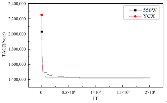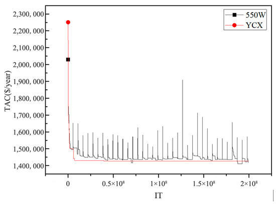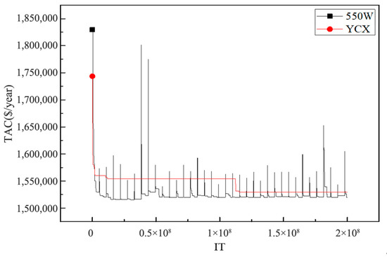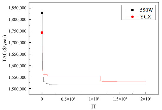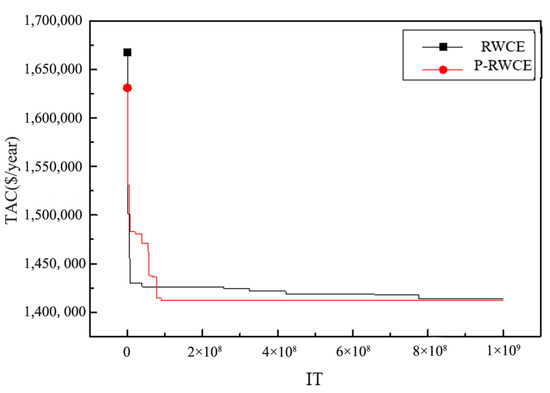 As shown in Figure 7, the RWCE adopting the participatory evolutionary strategy for streams can provide a better solution, which can significantly improve the solution efficiency and performance of the standard RWCE. In the participatory evolutionary strategy for streams y, the TAC increases sharply after the forced structure acceptance. However, every time the TAC increases, the original evolution direction is changed, and the local optimal value is discarded, thus enhancing the global search ability of the RWCE.