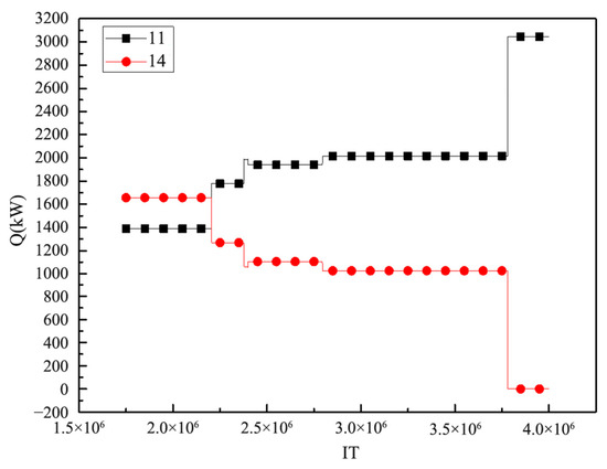 As shown in Figure 8 and Figure 9, the energy that can be recycled for each stream is fixed. In the early evolution stages, the number of heat exchangers is variable, even if there is no utility exchanger on the stream. In the later evolution stages, the number and the heat loads of the heat exchangers on the streams without utility exchangers remain almost constant. Therefore, to avoid unnecessary iteration steps in the later evolution stages and to improve the evolution efficiency, a weighted evolution strategy is proposed. That is, after the number of iterations in the later stages of the evolution exceeds ITGZ, certain measures are taken on the evolution of the existing individuals to identify the streams without utility exchangers. After each ITG3 iteration, the streams without utility exchangers do not participate in the evolution, while the remaining streams are involved in the evolution with the participatory evolutionary strategy for streams, which forces the structure to be accepted after the current iteration. Furthermore, ITG3 is set to be a multiple of ITG2 so as to retain the algorithm ability to avoid falling into local optimums and prevent unnecessary evolutionary steps to a certain extent as well as achieve a strong global optimization ability.