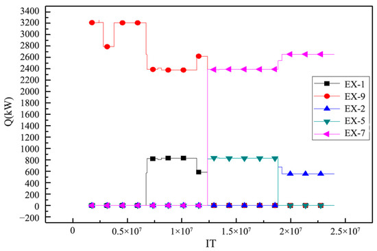 Based on the presented TAC curves of the participatory evolutionary strategy for streams, a lower TAC of the HEN structure can be obtained more rapidly after adopting the proposed strategy. However, the algorithm is prone to premature convergence in the later optimization stages, and it is difficult for it to avoid a local optimum and find a better HEN structure. Therefore, this study analyzes the variation in the individual heat loads for streams without utility exchangers in the later stages of the HEN evolution.