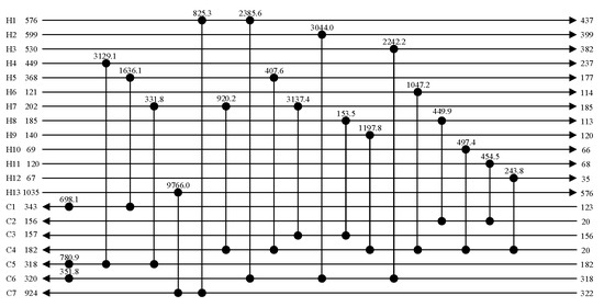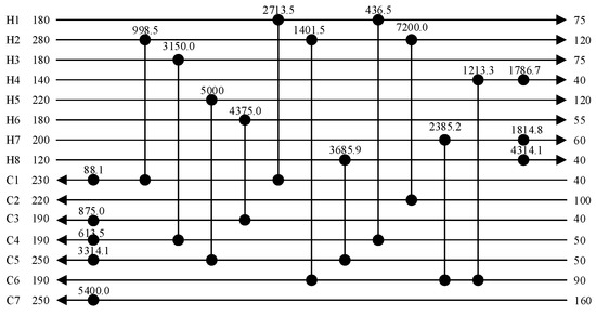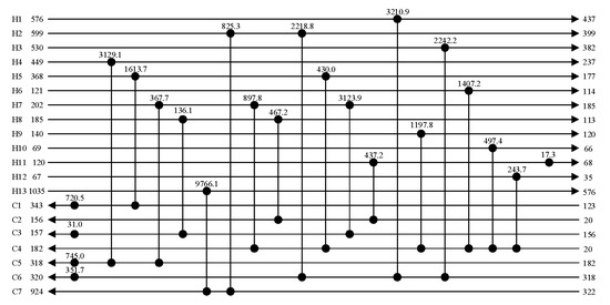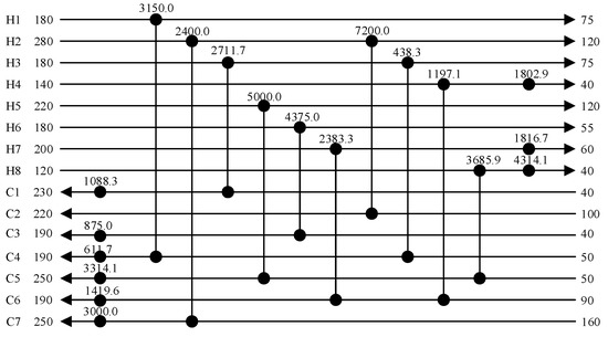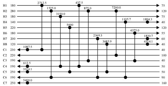 where Qh,c represents the heat load of the heat exchanger generated by a node h on the hot stream and a node c on the cold stream, and h = 1, 2, ..., NHNGDH, c = 1, 2, ..., NCNGDC; HM represents the number of nodes on the hot stream, and CM represents the number of nodes on the cold stream.