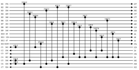 Comparing the solutions of Figure 11, Figure 12 and Figure 13, it can be observed that, when using the participatory evolution strategy, the utilities on H11 and C3 are eliminated, which makes the TAC decrease to 21,773 USD/year. When adding the weighted evolution strategy to the RWCE, two heat exchangers matching on the H1 promote the TAC to decrease to 1,396,348 USD/year, and the result shown in Figure 13 is lower by 66,015 USD/year. The quantified data confirm the effectiveness of the proposed strategy.