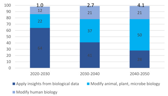 The 2020 summary was published by the German Federal Ministry of Education and Research (BMBF). The same Ministry appointed the High-Tech Forum in 2019, which published a far-reaching discussion paper on the convergence of biotechnologies with information technologies [21]. The paper referred to The High-Tech Strategy of 2025 (HTS), which “pursues the overarching goal of contributing to sustainable solutions to major social challenges”. Among others, the report stated that the SDG goal on health and wellbeing is paramount. This apparent contradiction between the bioeconomy strategy and the high-tech strategy in Germany is difficult to explain. However, it does show that Germany values this convergence as a source of future economic activity. Moreover, it recognises it in medicine, whereas the bioeconomy strategy does not.