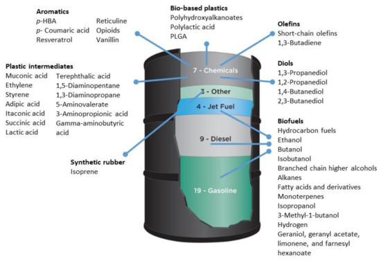 There have been hundreds if not thousands of metabolic engineering research papers where a bio-based chemical has been made in the research laboratory. Figure 2 illustrates some of the possibilities for replacing the oil barrel. It should be stressed that most of these successes have been in the laboratory. There has only been a tiny number of commercialisations, mainly due to difficulty in scale up to market.