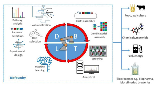 The biofoundry and the design-build-test-learn (DBTL) concept as a platform for manufacturing across a range of sectors. Adapted from [36].