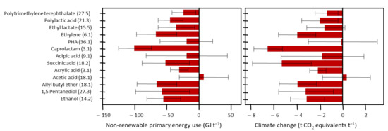 Average non-renewable primary energy use and GHG emissions of bio-based chemicals in comparison to conventional chemicals [40]. Numbers in parentheses indicate the sample size for the bio-based and conventional chemicals, respectively.