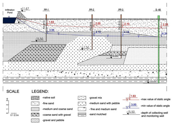 The passage starts at the bottom of the pond as the infiltration water enters the ground (aeration and saturation zones), with three piezometers on its way, and ends with the well S-48. The passage direction is perpendicular to the line of the pond bank and the line of collecting wells.