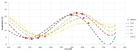 Analysis of changes of water temperature in soil throughout the infiltration route allowed to determine the infiltration time between the measuring points. Water which infiltrated in the soil flows in time determined by waves with the same temperature. The temperature was measured during the experiment at measuring points every 1–2 weeks. The graph that presents the temperature of the water measured at the measuring points is shown in Figure 2. The graphs of temperature changes during the measurement year at each measurement point are sinusoidal. The distances between the curves’ maxima (summer) and minima (winter) correspond to the times of travel of the wave of the same temperature and the same times of water flow between the measuring points. The distances of the measuring points from the bank of the pond and the average time when the water overcomes this distance are presented in Table 2.