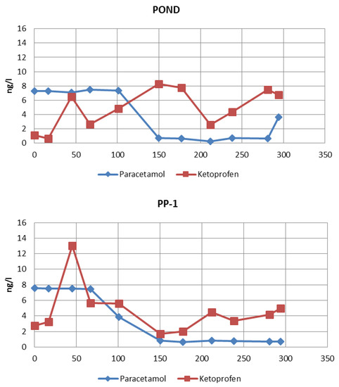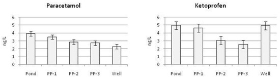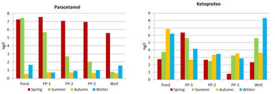 The concentrations of paracetamol and ketoprofen measured during the year, which were presented above (Figure 3, pond), show that the content of paracetamol in water collected from the pond ranged from 0.27 to 7.46 ng/L. It can be stated that the paracetamol concentration fluctuated, giving higher values in winter and spring, which corresponds with the higher NSAID consumption in these seasons. The content of ketoprofen in water samples from the pond ranged from 0.65 to 8.2 ng/L. It can be observed that the concentration of ketoprofen in surface pond water does not depend on the season, as in the case of paracetamol (Figure 3, pond).
