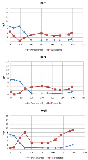 Paracetamol decreases gradually and steadily during the flow of infiltrating water. The annual ketoprofen concentration decreases on the way from the pond to the PP3 piezometer. Then, an increase in ketoprofen in the water taken from the well occurs especially in winter. This resulted in a very low average annual ketoprofen removal efficiency. Desorption is a phenomenon that may affect the final removal effect of NSAIDs during infiltration, which was observed in the case of ketoprofen.