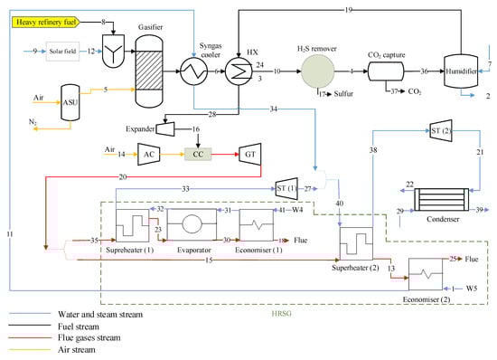 In the proposed ISGC system, the air first goes to the air separation unit (ASU), where the pure oxygen product stream (5) enters the gasifier. The superheated water vapor by the solar field is mixed with the heavy refinery fuel stream before entering the gasifier. In the syngas cooler, the heat from the syngas stream is utilized to saturate the water in the steam turbine. It should be observed that the fuel and syngas streams are represented by black lines in the schematic diagram in