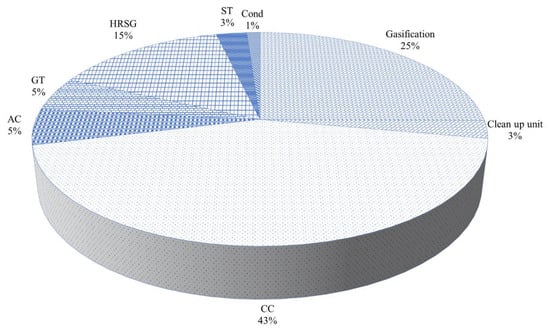 Figure 2. Hence, the combustion chamber, the gasifier, and the HRSG unit had the highest share of exergy destruction. The rate of exergy destruction in the combustion chamber was 43%, which can be reduced by implementing an optimal design approach. Compared to other similar cycles, a noteworthy point in the present system is the relatively low exergy destruction share of the gasifier (25%), which was due to the employment of the air separation unit and, thereby, the injection of pure oxygen.