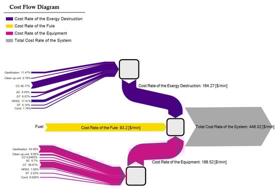 Figure 3 displays the cost flow diagram of the proposed system. As observed, the amount of exergoeconomic destruction of the combustion chamber, HRSG, and gasifier was higher than other equipment. Moreover, in terms of equipment cost rate, the highest cost was related to the gasifier, followed by the gas turbine. The remarkable point in this figure that distinguishes this system from other conventional cycles is that the total exergy destruction costs were lower than the total equipment costs. This is owed to the inexpensiveness of the fuel employed in this system, which was a direct function of the exergoeconomic destruction of the equipment.