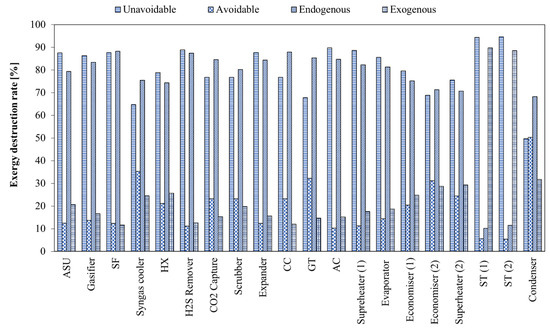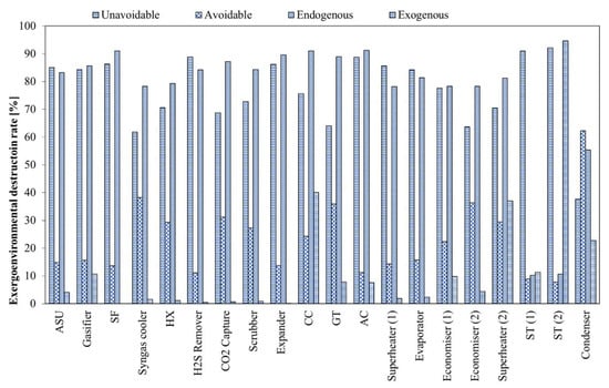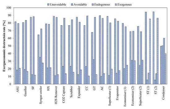 Figure 7. Similarly to the previous results, the condenser had the highest avoidable exergoenvironmental destruction share among the equipment units. Moreover, it is noticeable that the components unavoidable exergoenvironmental destruction share in all equipment was higher than avoidable (except for the condenser). In addition, components with high avoidable exergy destruction such as the condenser, syngas cooler, Economizer 2, and GT can be prioritized for modification to increase the exergoenvironmental efficiency. In this case, this modification can be grounded on the type of equipment used in terms of manufacturing processes and lower weight.