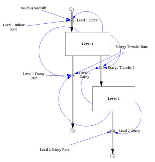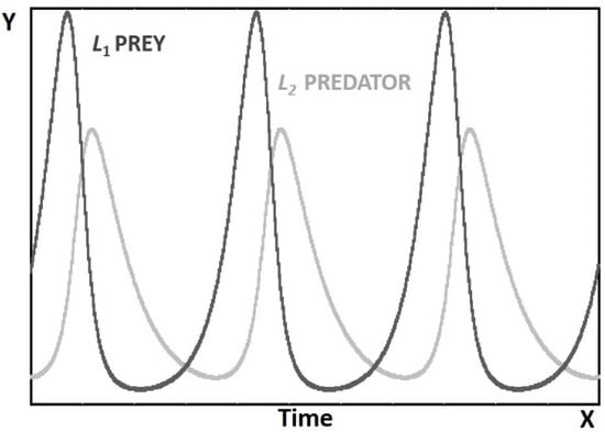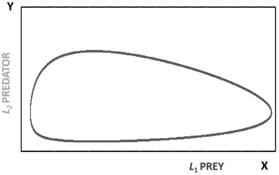 The Lotka–Volterra (LV) model was the first mathematical model describing a complex adaptive system (CAS) [9]. It was independently developed in the 1920s by Alfred Lotka [10] and Vito Volterra [11]. It was conceived to model the interplay between two biological populations at two different trophic levels: one of the two species being the predator and the other the prey. Often, these two levels are referred to as “foxes” and “rabbits”. In a wider sense, this model can describe the energy transfer between two energy levels, or stocks, linked by feedback relationships. Because of these feedbacks, this system can also be defined as “autocatalytic”.
